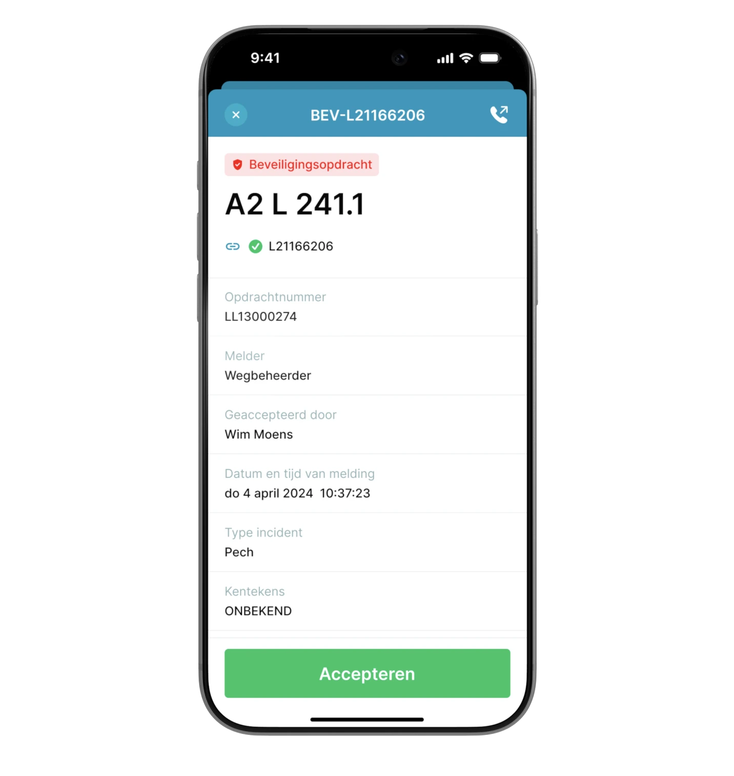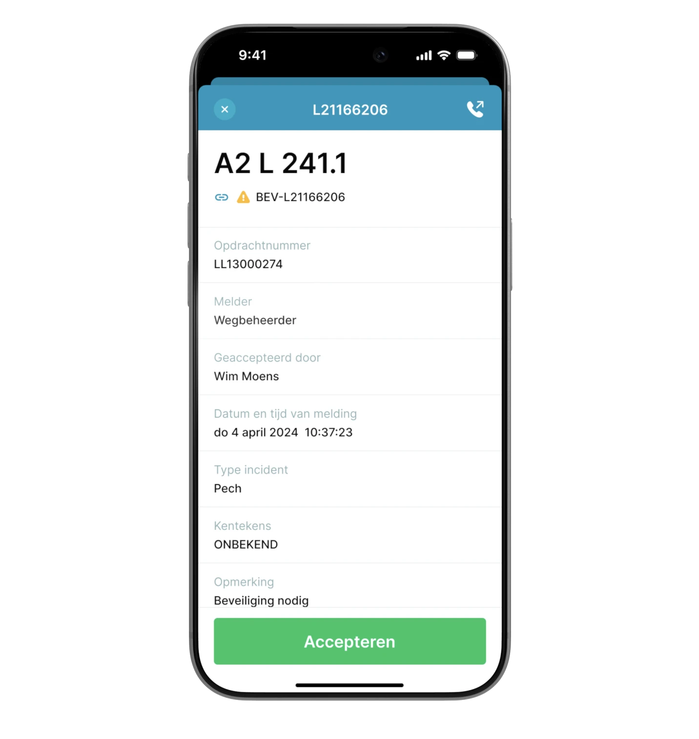 Een incident melding is een - door bijvoorbeeld een Verkeerscentrale - gemeld incident op een fysieke locatie op een Nederlandse hoofdweg. Door de melding te openen ziet een berger direct de locatie van de melding, bijvoorbeeld A9 R 26.3, samen met andere relevante informatie die is verzameld. Dit is ook het moment dat de teller voor berekening van zijn aanrijdtijd gaat lopen.