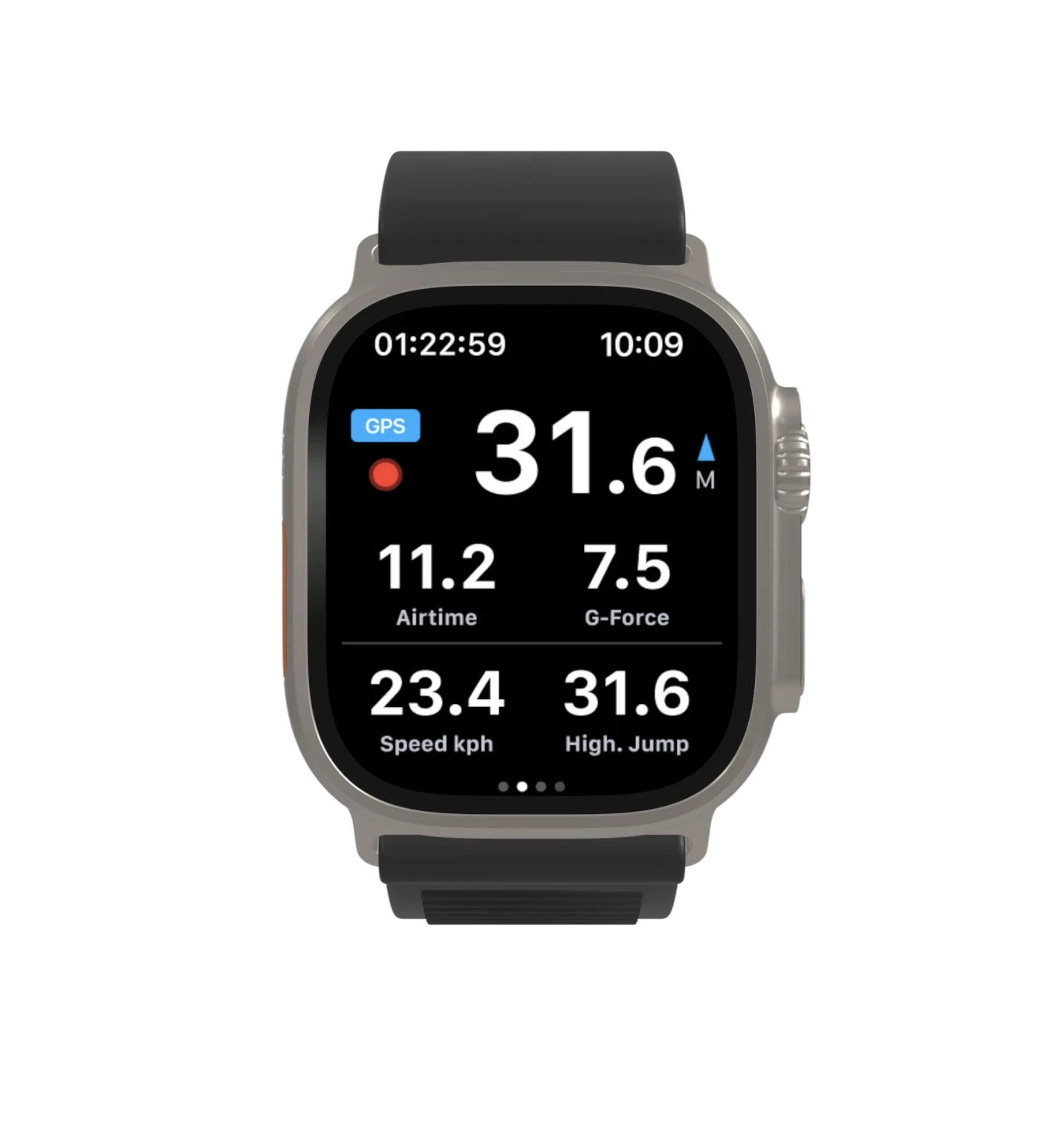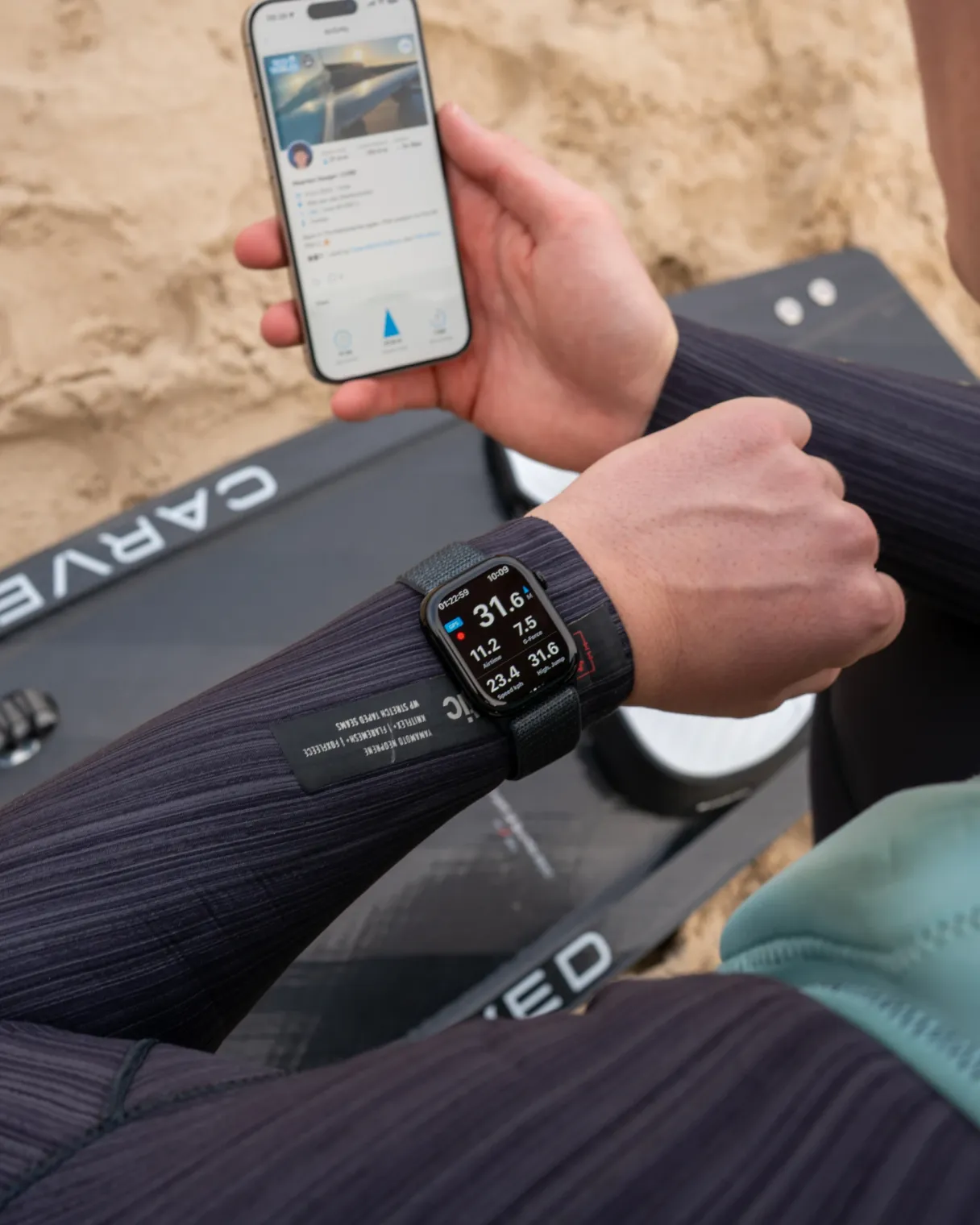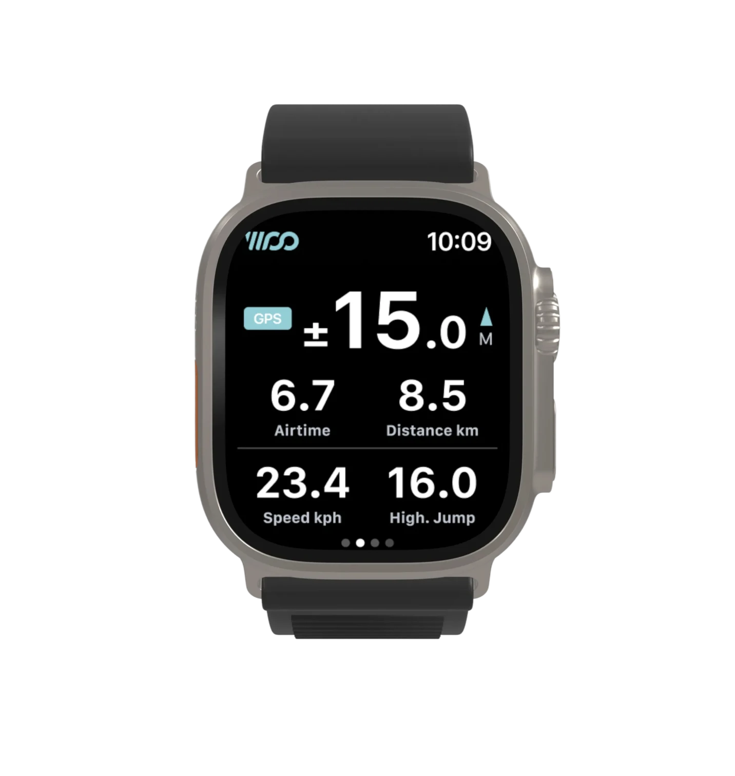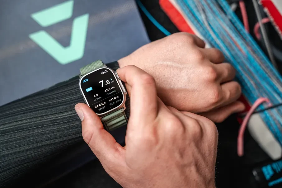 Met de WOO Smartwatch app registreert een gebruiker data over zijn sprongen tijdens een kitesurfsessie en toont informatie over de hoogte, duur en afstand van een sprong op de smartwatch.